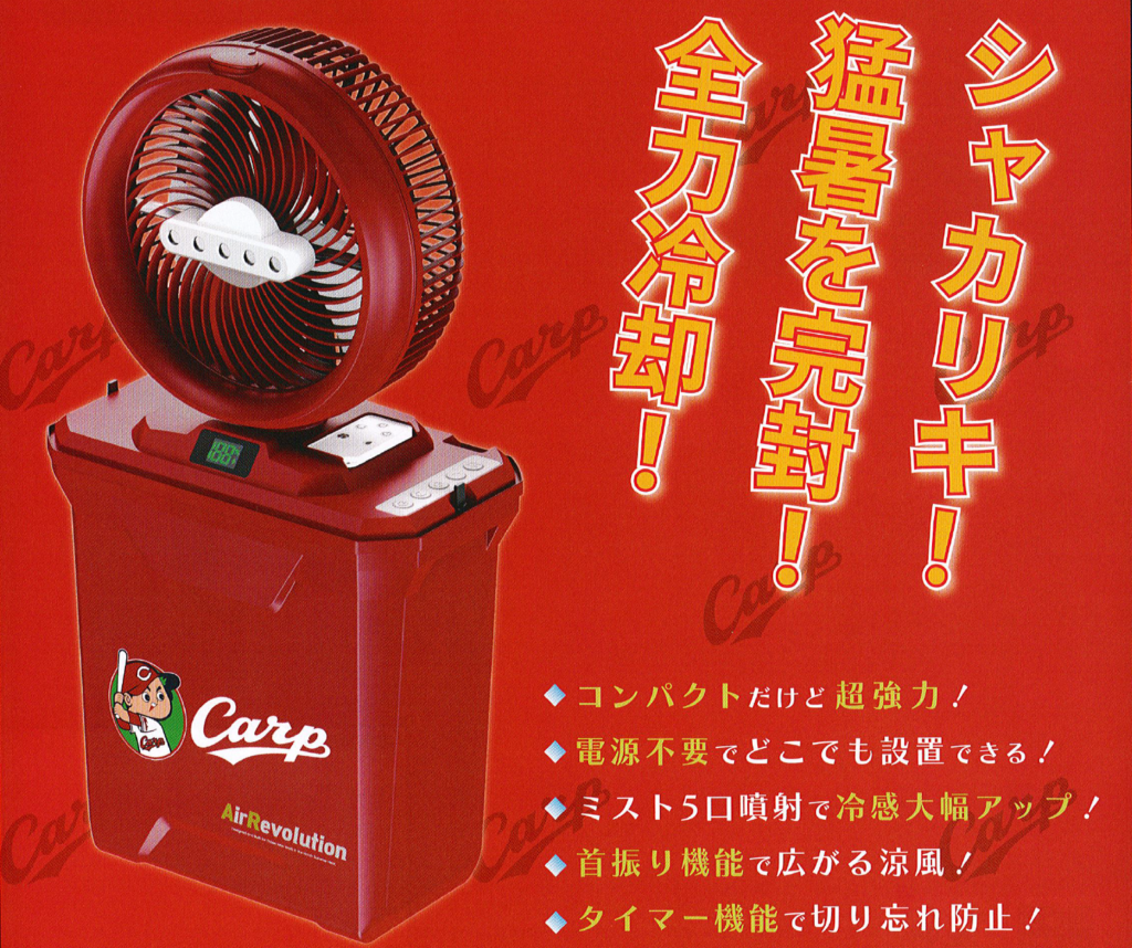 広島の株式会社エビスでは、様々なシーンで活躍する ARミストファン「Air Revolution」カープデザインモデルを取り扱っています。 屋内外問わず使える高性能ミストファンで、イベント・スポーツ観戦・作業現場など幅広く活躍します。